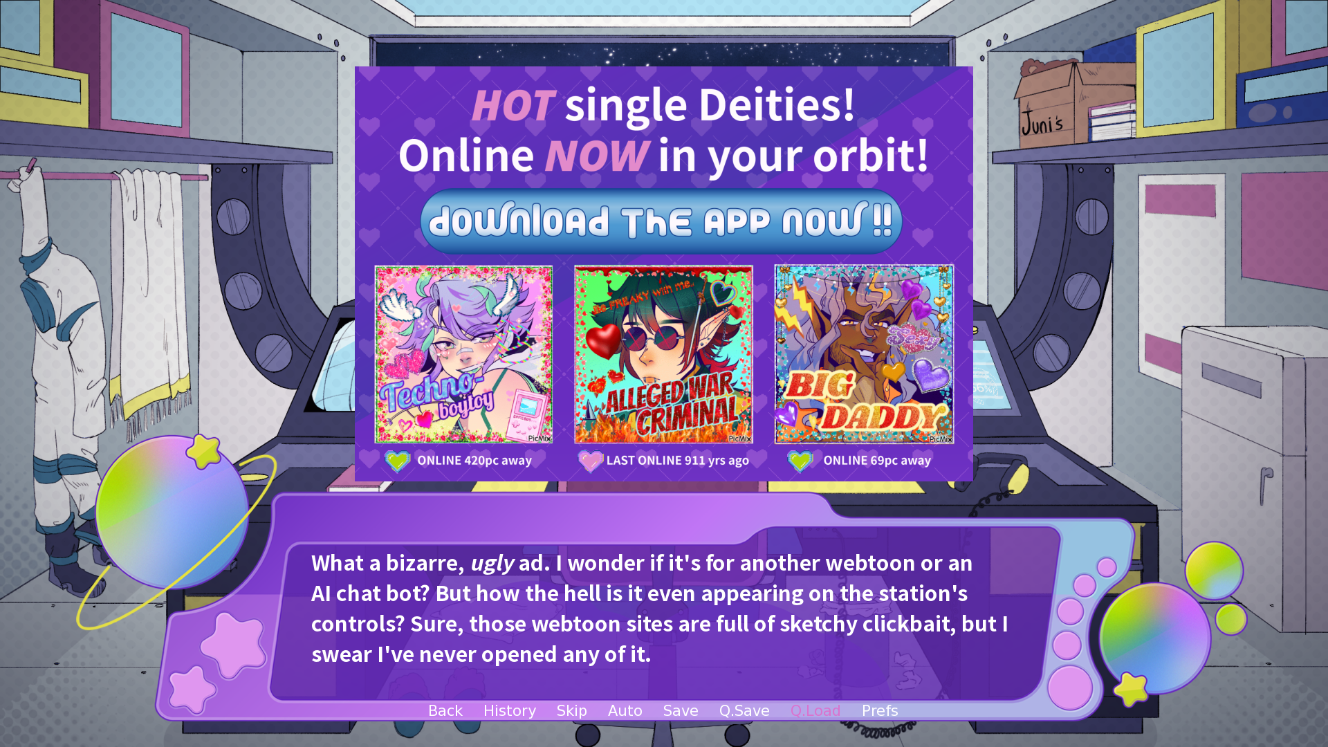 In My Orbit is a chat-sim style otome visual novel. Abandoned in space, all hope seems lost until you receive a strange signal... which installs a dating app onto your computer of all things!? You finally have someone to talk to, maybe you won't die alone and a virgin in space after all...